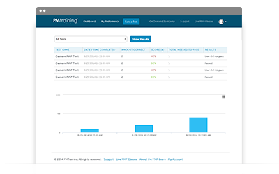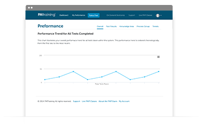 The personalized My Performance tab will help you focus your PMI-ACP study efforts by analyzing your performance. Each PMI-ACP practice test you take is tracked to give you a summary view of your performance trend over time.